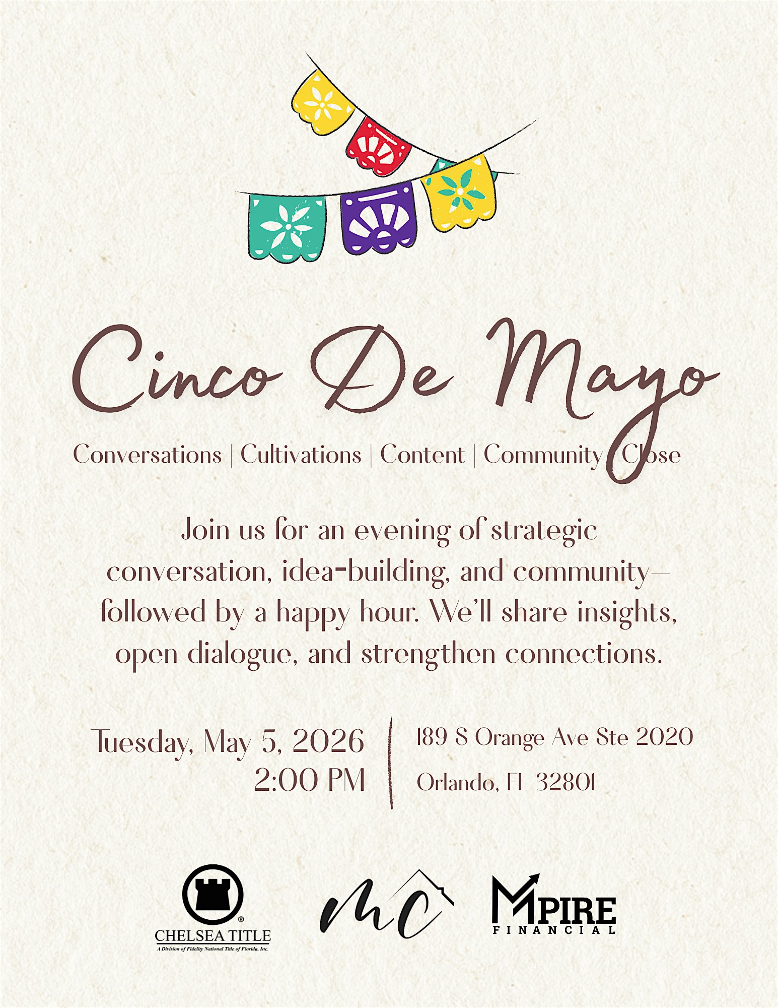 Cinco de Mayo with the 5 C’s at 189 S Orange Ave ste 2020 – Orlando, FL Cinco de Mayo with the 5 C’s at 189 S Orange Ave ste 2020 – Orlando, FL 4 4 people viewed this event. Join us for some workshops followed by Happy Hour! Tickets-RSVP Link Register for event Date And Time Tuesday, May 5th, 2026 @ 02:00 PM Location 189 South Orange Avenue, Orlando, FL 32801 Event Types Community & CultureFestival or Fair Event Category FloridaOrlando Share With Friends Facebook Twitter Linkedin Xing Pinterest