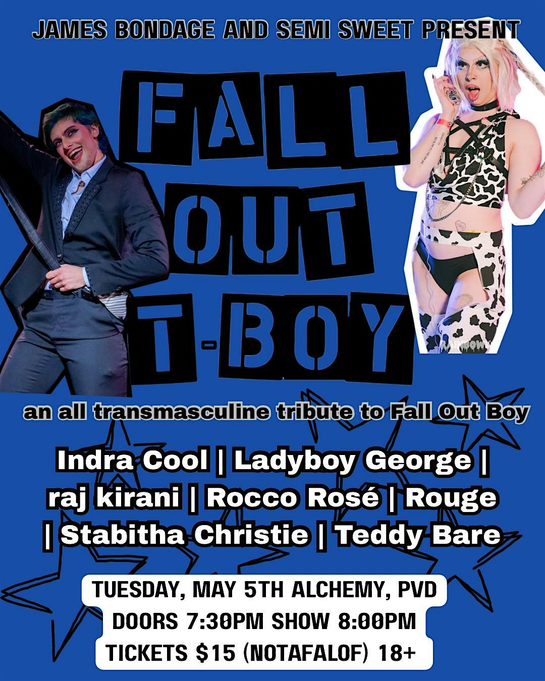 Fall Out T-Boy at Alchemy – Providence, RI Fall Out T-Boy at Alchemy – Providence, RI 3 3 people viewed this event. A trans masc drag and burlesque showcase featuring performances set to music by Fall Out Boy. Tickets-RSVP Link Register for event Date And Time Tuesday, May 5th, 2026 @ 07:00 PM Location 171 Chestnut Street, Providence, RI 2903 Event Types Concert or PerformanceMusic Event Category ProvidenceRhode Island Share With Friends Facebook Twitter Linkedin Xing Pinterest