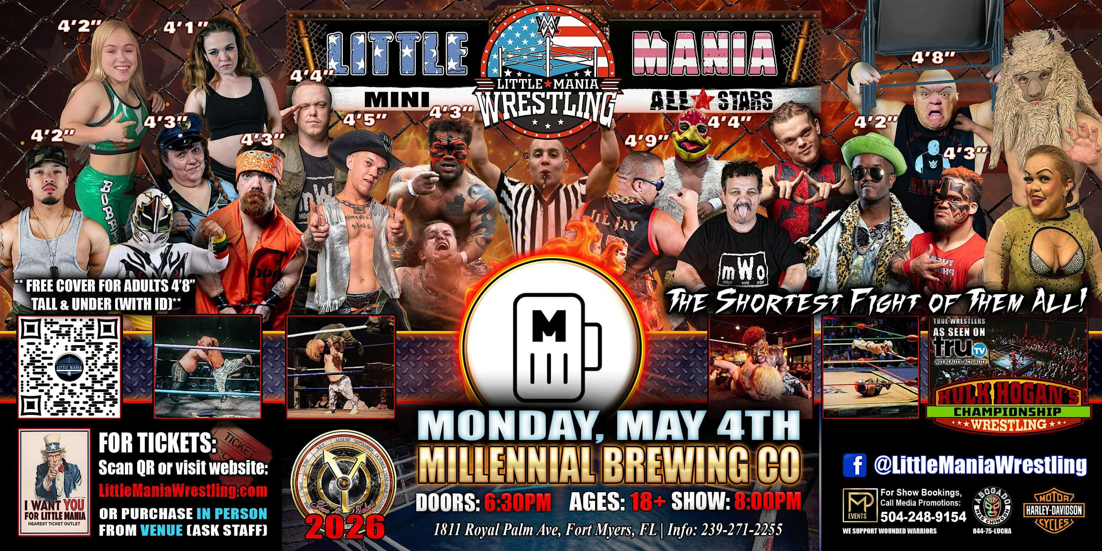 by admin14Feb Ft Myers, FL – Little Mania Mini Wrestling @ Millennial Brewing Co at 1811 Royal Palm Ave – Fort Myers, FL Ft Myers, FL – Little Mania Mini Wrestling @ Millennial Brewing Co at 1811 Royal Palm Ave – Fort Myers, FL 1 1 people viewed this event. “The Shortest Fight of them All!” Little People Flying Fists Match Trash Can Slams Cheese Graters Slap Ladder Dives OH MY GOD tiny hands Tickets-RSVP Link Date And Time Tuesday, May 5th, 2026 12:00 AM (PST) Venue 1811 Royal Palm Ave Location 1811 Royal Palm Avenue, Fort Myers, FL 33901 Event Types Concert or PerformancePerforming & Visual Arts Event Category Florida Share With Friends Facebook Twitter Linkedin Xing Pinterest Share This Post: