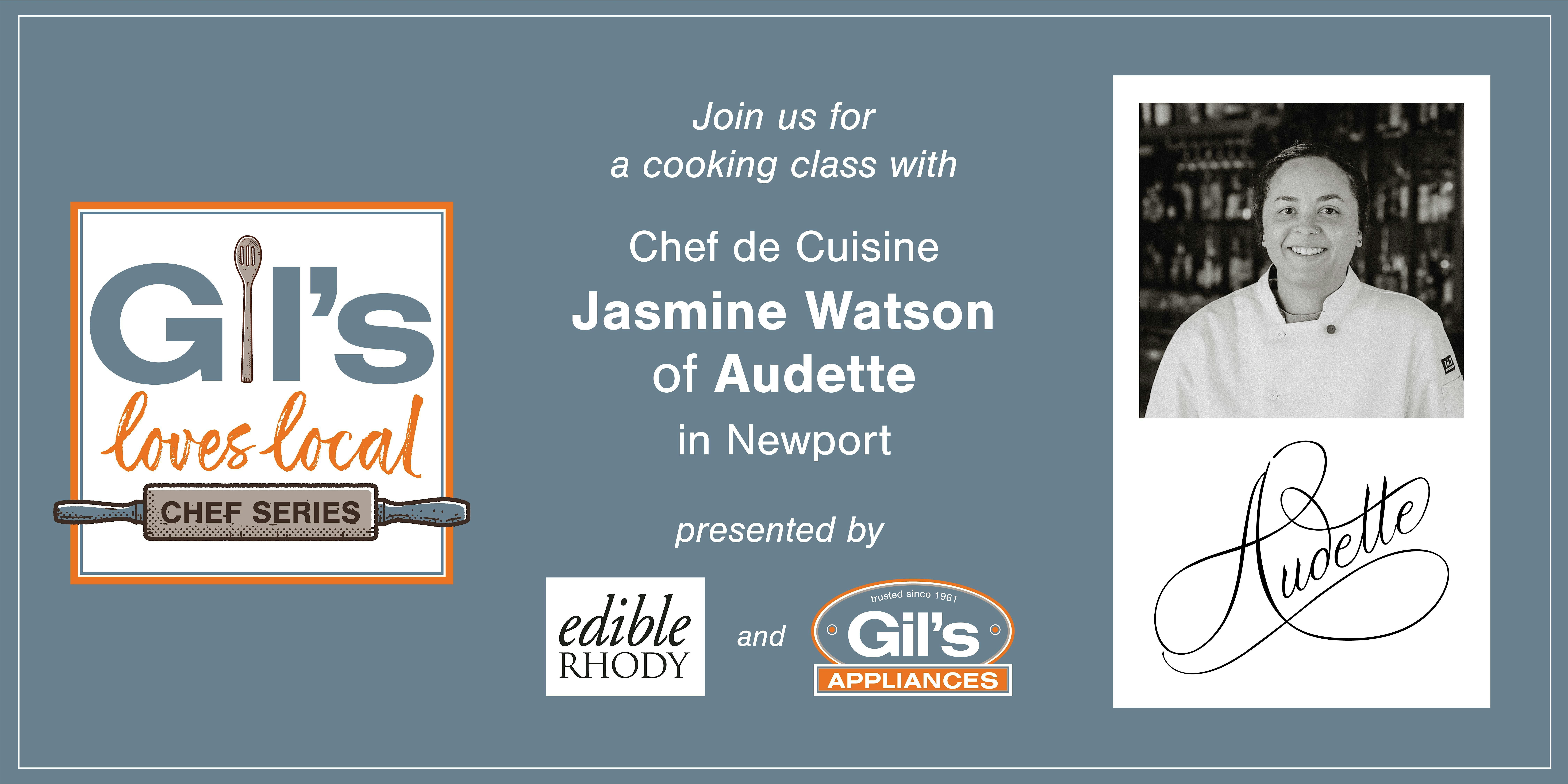 Join us as we welcome James Beard Award–nominated Chef de Cuisine Jasmine Watson of Audette in Newport to the Gil’s Appliances Thermador demonstration kitchen. Watson will share her French-inspired approach to cooking with an emphasis on local, seasonal ingredients. She will demonstrate her techniques and kitchen wisdom while preparing thoughtfully crafted dishes. Enjoy generous tastings paired with wine and take home a goody bag with special giveaways.