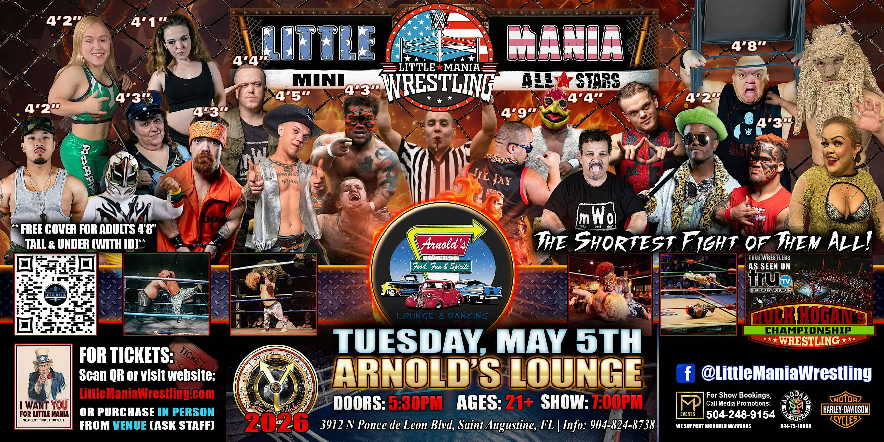 by admin14Feb St Augustine, FL – Little Mania Mini Wrestling @ Arnold’s Lounge at 3912 N Ponce De Leon Blvd – St. Augustine, FL St Augustine, FL – Little Mania Mini Wrestling @ Arnold’s Lounge at 3912 N Ponce De Leon Blvd – St. Augustine, FL 3 3 people viewed this event. “The Shortest Fight of them All!” Little People Flying Fists Match Trash Can Slams Cheese Graters Slap Ladder Dives OH MY GOD tiny hands Tickets-RSVP Link Date And Time Tuesday, May 5th, 2026 11:00 PM (PST) Venue 3912 N Ponce De Leon Blvd Location 3912 North Ponce De Leon Boulevard, St. Augustine, FL 32084 Event Types Concert or PerformancePerforming & Visual Arts Event Category Florida Share With Friends Facebook Twitter Linkedin Xing Pinterest Share This Post: