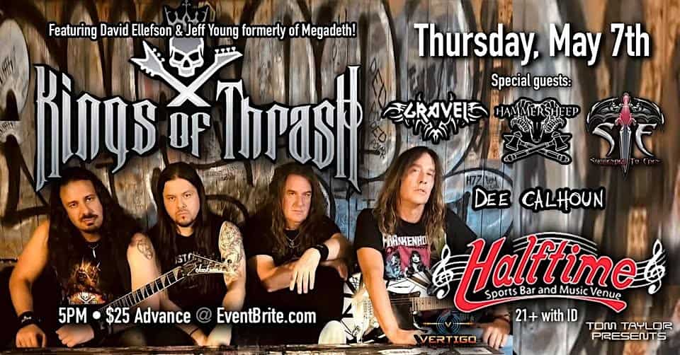 by admin14Feb KINGS OF THRASH ELLEFSON and YOUNG of MEGADETH and more at Halftime Sports and Music – Newark, DE KINGS OF THRASH ELLEFSON and YOUNG of MEGADETH and more at Halftime Sports and Music – Newark, DE 1 1 people viewed this event. Get ready to rock out with the legendary Kings of Thrash – Featuring Ellifson and Young from Megadeth – it’s gonna be epic! Tickets-RSVP Link Date And Time Thursday, May 7th, 2026 09:00 PM (PST) Venue Halftime Sports and Music Location 618 Plaza Drive, Newark, DE 19702 Event Types Concert or PerformancePerforming & Visual Arts Event Category Delaware Share With Friends Facebook Twitter Linkedin Xing Pinterest Share This Post: