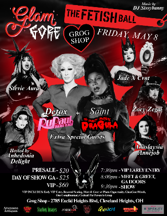 Friday, May 8GlamGore: The Fetish BallVIP Early Entry 7:30 p.m. | Meet & Greet 8 p.m.GA Doors 8 p.m. | Show 9:30 p.m.ALL AGES $20 GA / $25 DOS / $60 VIP+ $3 at the door if under 21 WHOSE BIRFDAYS ARE IT?! WELL Its time! Annie completes her 33 years around the sun Lord, have mercy. Everyone say, THANK YOU ANNIE! Be sure to laugh, hoot, holler, and love on the premier Gollum impersonator this spring! Annies top love languages are acts of service, quality time, and receiving gifts, so plan accordingly! In addition to jokes and laughter, this event emphasizes a strong FETISH element. Drag entertainers far and wide will plan their sexiest and most ostentatious performances yet!Featuring performances by Stevie Aura (OH), // Anaslaysia Annejob (OH) // Zoey Zegai (OH) // Jade X Cvnt (OH) with Extra Special Guests Saint (IL) from the Boulet Brothers Dragula Season 3, 4 and Winner of Resurrection s Drag Race Season 5 and Finalist of RuPauls Drag Race All Stars 2!Clevelands Vixen of Versatility, Anhedonia Delight, is proud to present GlamGore, the monthly, critically acclaimed alternative and themed drag show series housed at the legendary Grog Shop!Located in Cleveland Heights Coventry Village, GlamGore is one of few premier and highly acclaimed alternative drag shows in Ohio. Produced, marketed, and hosted by Anhedonia Delight, GlamGore has established itself as a successful and empowering presence in the Cleveland drag scene and beyond. GlamGore attracts audiences for their love and appreciation of drag and performers for their interest in showcasing their drag skills as an art form. Highlighted in Cleveland Scene Magazine Femme Fatale of Filth, Anhedonia Delight, aims to push the boundaries of drag and give opportunities to people to share their art in a safe and supportive space.Each month, GlamGore features a variety of performance artists under one roof, ranging from beauty queens to drag monsters! As the hostess and manager of GlamGore, Anhedonia Delight has had the pleasure of booking artists from across the country, including artists seen on RuPauls Drag Race, Camp Wannakiki Dragula! As of 2026, GlamGore celebrates 7 years and continues to draw in large crowds of all shapes, sizes, and backgrounds.For more information, please visit www.grogshop.gs or call the Grog Shop at (216) 321-5588 for details! Please follow GlamGore on Instagram at @GlamGoreCLE for all event updates, promotions, and ticket purchases!