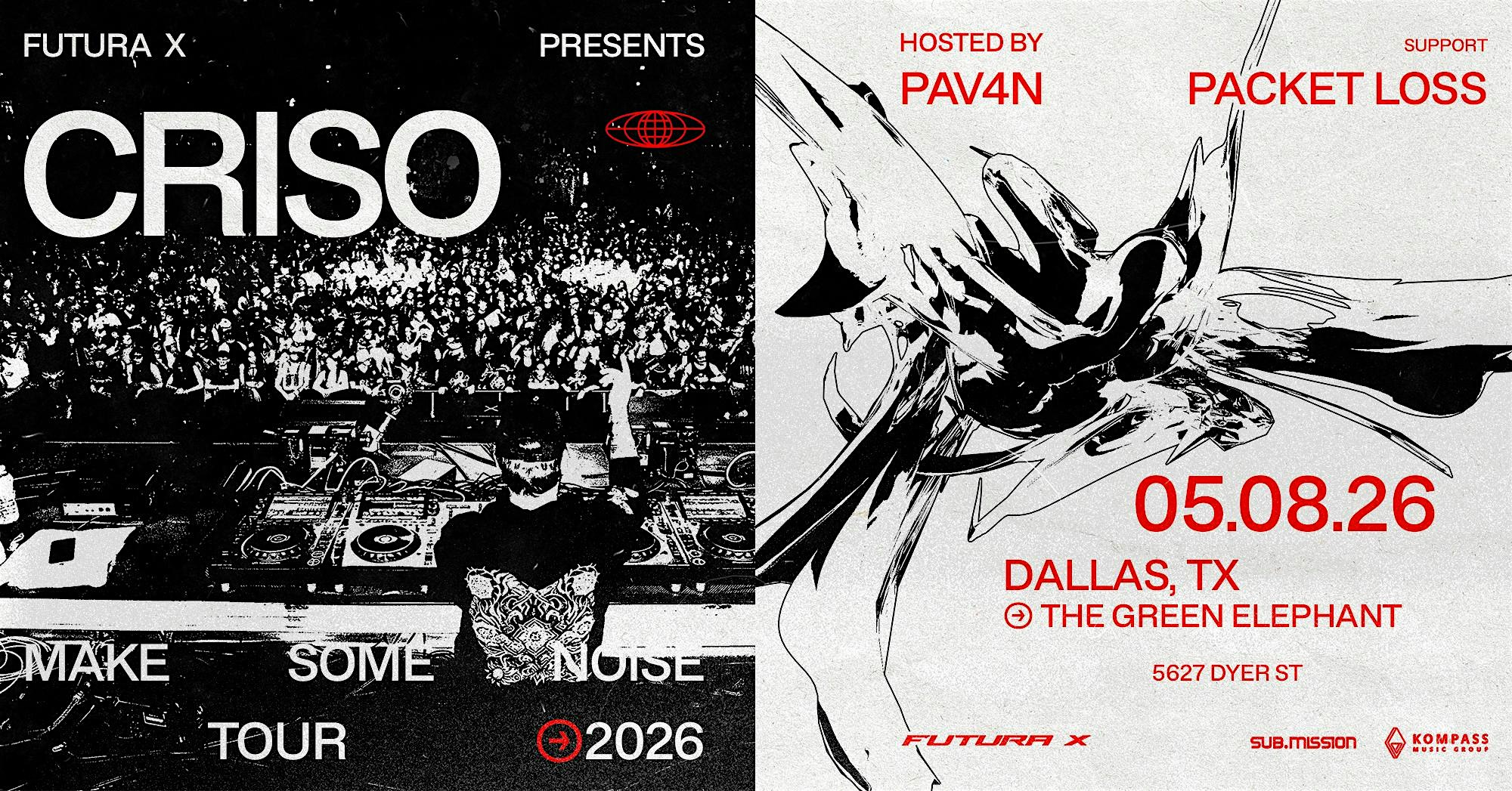 by admin13Feb FUTURA X PRESENTS: Criso’s Make Some Noise Tour at Green Elephant – Dallas, TX FUTURA X PRESENTS: Criso’s Make Some Noise Tour at Green Elephant – Dallas, TX 2 2 people viewed this event. Criso brings his MAKE SOME NOISE Tour to Dallas this May in support of his debut DEEP MEDi EP. Joining him are special guest host and legend Tickets-RSVP Link Date And Time Saturday, May 9th, 2026 02:00 AM (PST) Venue Green Elephant Location 5627 Dyer Street, Dallas, TX 75206 Event Types Concert or PerformanceMusic Event Category DallasTexas Share With Friends Facebook Twitter Linkedin Xing Pinterest Share This Post: