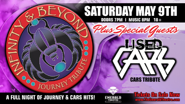 Bringing you the songs you love, the way you remember them! Infinity s biggest and most impressionable bands.Website: https://www.infinityandbeyondjourneytribute.com/Video: https://youtu.be/hoE9Hf2_kNwThe Cars dominated the 80s new wave synth-pop scene, and The Used Cars keep that music faithfully alive. You might think youre hearing the real thing with dual lead singers nailing the parts of Ric Ocasek and Benjamin Orr. This band loves the music as much as you do, driving them to find that extra magic to give you just what you needed on the dance floor. Website: https://www.thecarsband.com/Video: https://youtu.be/0XW6BUL7DbsDOORS 7PM | SHOW 8PM | 18+ Box Office Opens 5:30PM Day of Show – $5 Ticket IncreaseFREE PARKING – Located Behind the Theatre**ALL TICKETS INCLUDE ACCESS TO MAIN LEVEL DANCE FLOOR**Second Floor Balcony Seating$22 ADVANCE | $27 DAY OF SHOWIncludes access to the main level dance floor & unassigned 2nd floor balcony seating.ADA Seating$22 ADVANCE | $27 DAY OF SHOWIncludes access to the main level dance floor & special seating for guests with disabilities.Main Floor Single$27 ADVANCE | $32 DAY OF SHOWIncludes unassigned main floor table seating and main level dance floor access.Main Floor Table of 8*$215Seats 8 guests maximum, includes admission for 8, assigned reserved seating on main floor.Opera Box*$215Seats 4 maximum, includes admission for 4, VIP seating, cocktail service.​*NOTE: (1) Ticket provided per Main Floor Table or Opera Box; Incomplete parties can be seated, please have ticket holders name available. Check in is located inside the Main Lobby. Tables will be assigned by the Theatre. To purchase more than (3) Main Floor Tables, or an ADA Main Floor Table please call the Theatre to reserve 586-630-0120.Sky Box $1,000Includes seating and admission for 30, commemorative lanyard for each guest, private bar and bartender. Appetizers available, call for selections and pricing. Located on the third floor of the theatre. To book please call (586) 630-0120 or email Info@TheEmeraldTheatre.com.