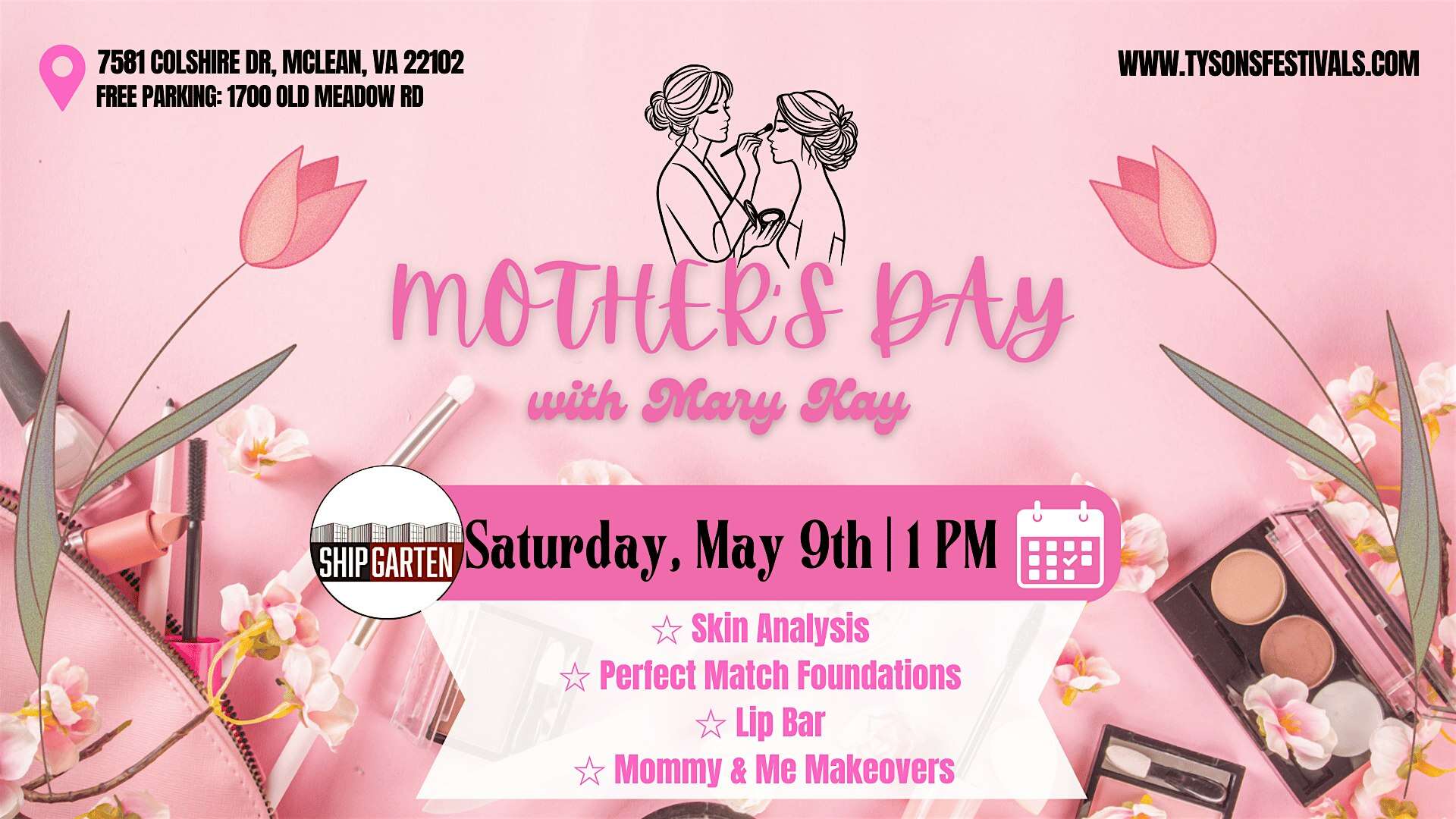 by admin14Feb Mothers Day with Mary Kay at 7581 Colshire Dr – Tysons, VA Mothers Day with Mary Kay at 7581 Colshire Dr – Tysons, VA 2 2 people viewed this event. Mother’s Day weekend is all about mother + daughter time, come to Shipgarten for a mothers day special with Mary Kay. Tickets-RSVP Link Date And Time Saturday, May 9th, 2026 05:00 PM (PST) Venue 7581 Colshire Dr Location 7581 Colshire Drive, Tysons, VA 22102 Event Types Fashion & BeautyParty or Social Gathering Event Category Virginia Share With Friends Facebook Twitter Linkedin Xing Pinterest Share This Post: