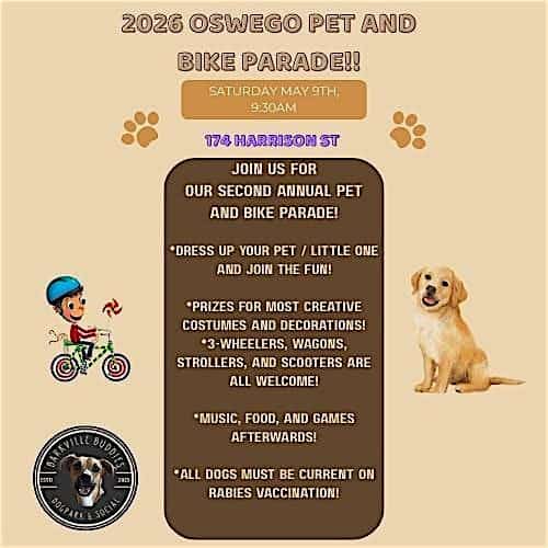 by admin14Feb Oswego’s Second Annual Pet and Bike Parade! at 174 S Harrison St – Oswego, IL Oswego’s Second Annual Pet and Bike Parade! at 174 S Harrison St – Oswego, IL 1 1 people viewed this event. Join the fun at Oswego’s Second Annual Pet and Bike Parade—pets, bikes, and good vibes all around! Tickets-RSVP Link Date And Time Saturday, May 9th, 2026 02:00 PM (PST) Venue 174 S Harrison St Location 174 South Harrison Street, Oswego, IL 60543 Event Types Community & CultureParty or Social Gathering Event Category Illinois Share With Friends Facebook Twitter Linkedin Xing Pinterest Share This Post: