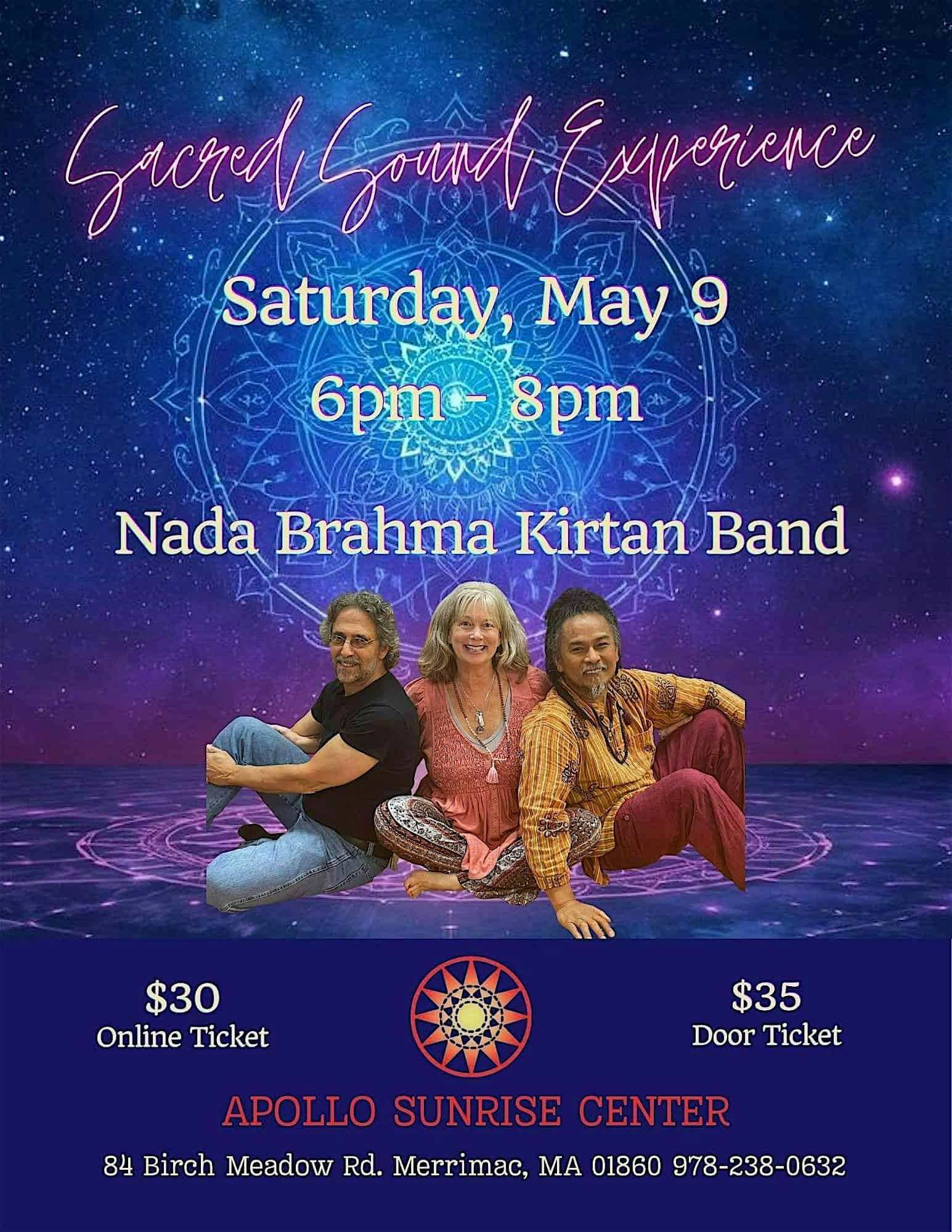 by admin14Feb Sacred Sound Experience with Nada Brahma Kirtan Band at Apollo Sunrise Center – Merrimac, MA Sacred Sound Experience with Nada Brahma Kirtan Band at Apollo Sunrise Center – Merrimac, MA 1 1 people viewed this event. Try Kirtan! It’s uplifting and healing music. You can sing along or just enjoy the experience! Tickets-RSVP Link Date And Time Saturday, May 9th, 2026 10:00 PM (PST) Venue Apollo Sunrise Center Location 84 Birch Meadow Road, Merrimac, MA 1860 Event Types Concert or Performance Event Category Massachusetts Share With Friends Facebook Twitter Linkedin Xing Pinterest Share This Post: