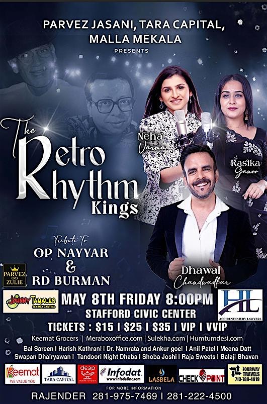 by admin13Feb The Retro Rhythms Kings | Tribute to OP Nayyar & RD Burman (Houston Event) at Stafford Civic Center – Stafford, TX The Retro Rhythms Kings | Tribute to OP Nayyar & RD Burman (Houston Event) at Stafford Civic Center – Stafford, TX 2 2 people viewed this event. The Retro Rhythms Kings | Tribute to OP Nayyar & RD Burman – Neha Varma | Dhawal Chandwadkar | Rasika Ganoo Tickets-RSVP Link Date And Time Saturday, May 9th, 2026 01:00 AM (PST) Venue Stafford Civic Center Location 1415 Constitution Avenue, Stafford, TX 77477 Event Types Concert or PerformanceMusic Event Category Texas Share With Friends Facebook Twitter Linkedin Xing Pinterest Share This Post: