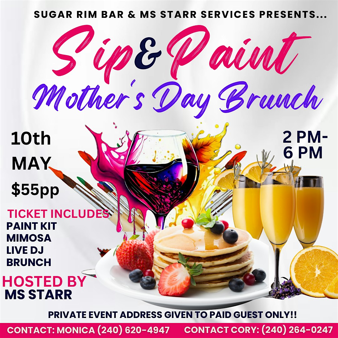 by admin13Feb Annual Mother’s Day SIP & PAINT Brunch!! at SUGAR RIM BAR INC – Temple Hills, MD Annual Mother’s Day SIP & PAINT Brunch!! at SUGAR RIM BAR INC – Temple Hills, MD 2 2 people viewed this event. An event made for Amazing MOTHER’S & MOTHER FIGURES!!! Get ready to EAT, SIP, PAINT, DANCE, & SHOP!! Tickets-RSVP Link Date And Time Sunday, May 10th, 2026 06:00 PM (PST) Venue SUGAR RIM BAR INC Location 4886 Stamp Road, Temple Hills, MD 20748 Event Types Party or Social Gathering Event Category MarylandNational Harbor Share With Friends Facebook Twitter Linkedin Xing Pinterest Share This Post: