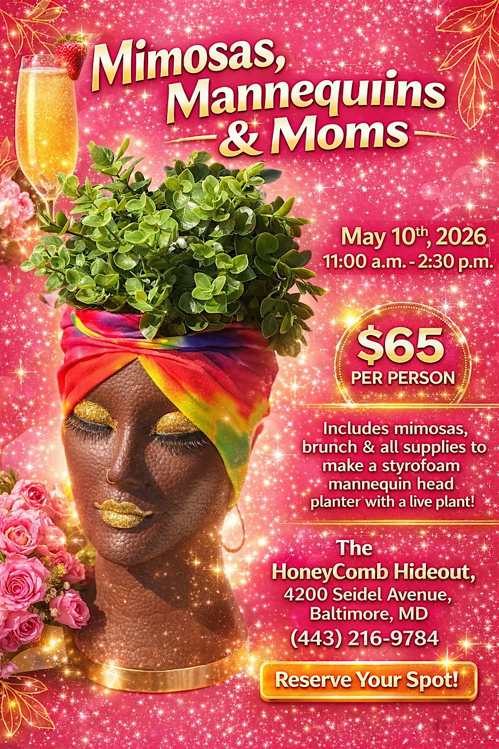 by admin13Feb Mimosas, Mannequins & Moms at The Honeycomb Hideout – Baltimore, MD Mimosas, Mannequins & Moms at The Honeycomb Hideout – Baltimore, MD 2 2 people viewed this event. A creative Mother’s Day experience where we brunch, sip bubbly and turn styrofoam mannequin heads into stunning custom planters. Tickets-RSVP Link Date And Time Sunday, May 10th, 2026 03:00 PM (PST) Venue The Honeycomb Hideout Location 4200 Seidel Avenue, Baltimore, MD 21206 Event Types Party or Social GatheringSeasonal & Holiday Event Category BaltimoreMaryland Share With Friends Facebook Twitter Linkedin Xing Pinterest Share This Post: