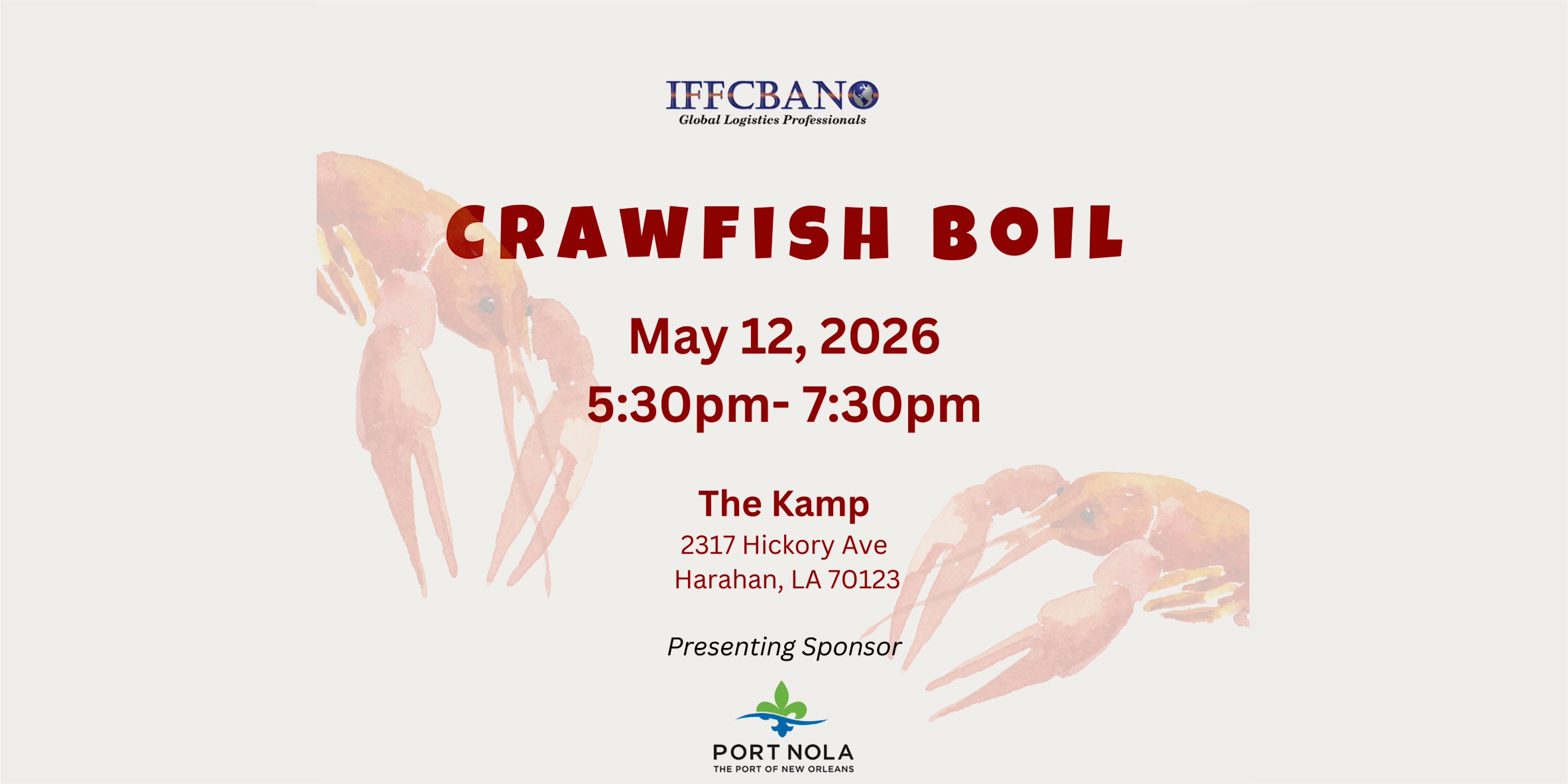 by admin13Feb 2026 IFFCBANO Crawfish Boil at The Kamp – Harahan, LA 2026 IFFCBANO Crawfish Boil at The Kamp – Harahan, LA 1 1 people viewed this event. Come enjoy a crawfish boil, meet fellow professionals from various industries, and expand your network in a fun, relaxed environment! Tickets-RSVP Link Date And Time Tuesday, May 12th, 2026 10:00 PM (PST) Venue The Kamp Location 2317 Hickory Avenue, Harahan, LA 70123 Event Types Food & DrinkParty or Social Gathering Event Category Louisiana Share With Friends Facebook Twitter Linkedin Xing Pinterest Share This Post:
