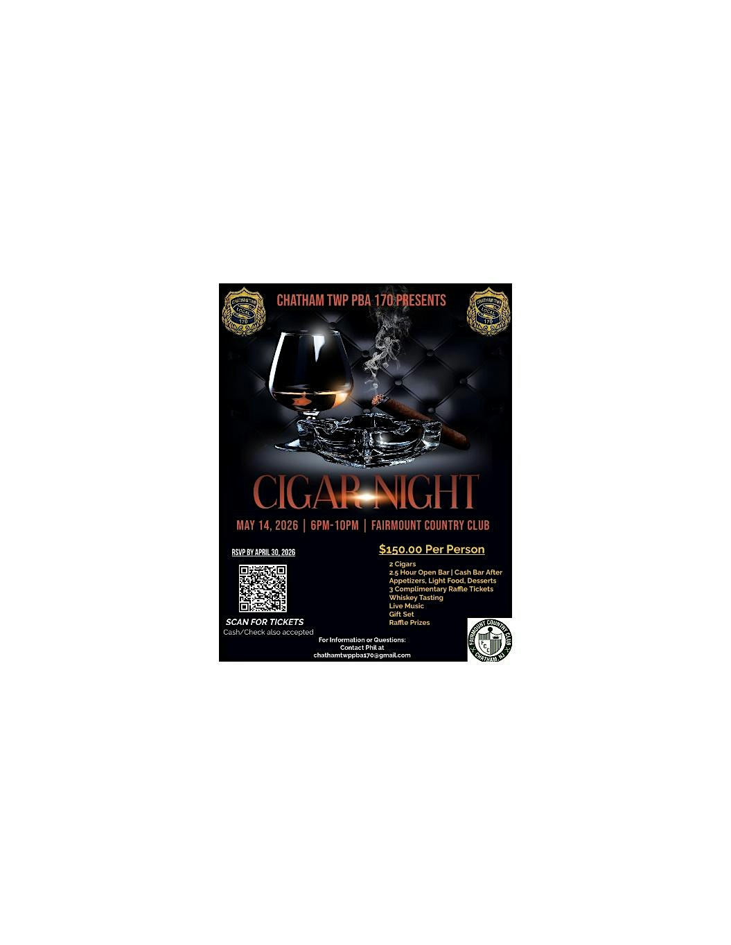 by admin13Feb Chatham Twp PBA 170 Cigar Night at Fairmount Country Club – Chatham Township, NJ Chatham Twp PBA 170 Cigar Night at Fairmount Country Club – Chatham Township, NJ 1 1 people viewed this event. Get ready to enjoy a relaxing evening with good company and great cigars at the Chatham Twp PBA 170 Cigar Night! Tickets-RSVP Link Date And Time Thursday, May 14th, 2026 10:00 PM (PST) Venue Fairmount Country Club Location 400 Southern Boulevard, Chatham Township, NJ 7928 Event Types Charity & CausesParty or Social Gathering Event Category New Jersey Share With Friends Facebook Twitter Linkedin Xing Pinterest Share This Post: