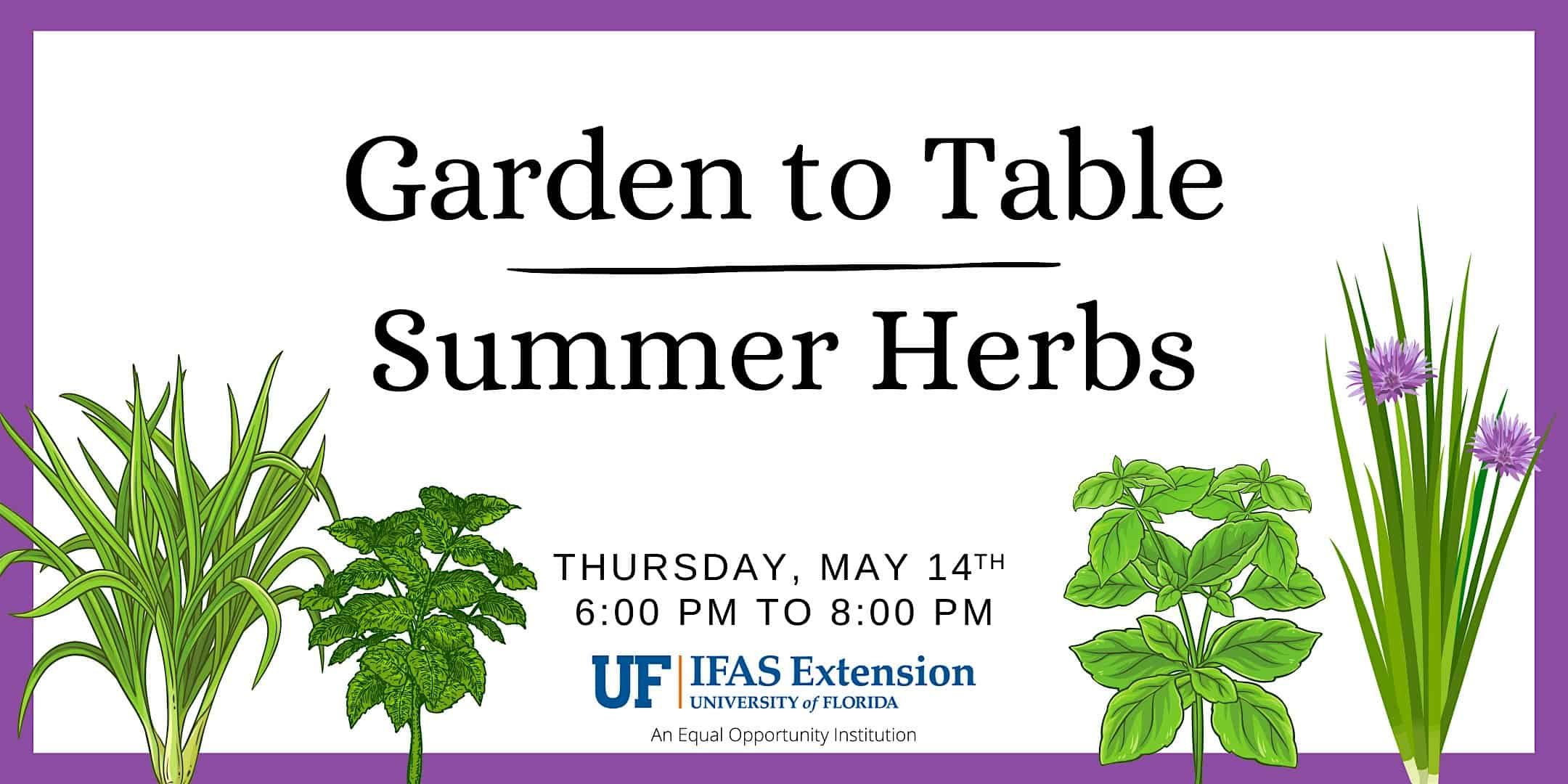 by admin14Feb Garden to Table: Summer Herbs at UF/IFAS Extension Jackson County – Marianna, FL Garden to Table: Summer Herbs at UF/IFAS Extension Jackson County – Marianna, FL 1 1 people viewed this event. This is the third session in a 3-part series focused on growing and cooking food from your own garden. Tickets-RSVP Link Date And Time Thursday, May 14th, 2026 11:00 PM (PST) Venue UF/IFAS Extension Jackson County Location 2741 Penn Avenue, Marianna, FL 32448 Event Types Food & Drink Event Category Florida Share With Friends Facebook Twitter Linkedin Xing Pinterest Share This Post: