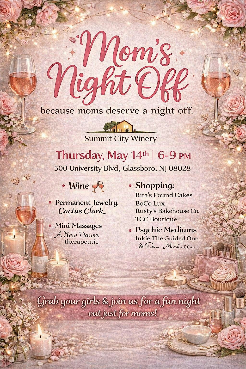 by admin13Feb Mom’s Night Off At Summit City Winery at Summit City Farms & Winery – Glassboro, NJ Mom’s Night Off At Summit City Winery at Summit City Farms & Winery – Glassboro, NJ 1 1 people viewed this event. Mom’s Night Off May 14th | 6:00 PM – 9:00 PM Grab your girls and treat yourself to a night out! Tickets-RSVP Link Date And Time Thursday, May 14th, 2026 10:00 PM (PST) Venue Summit City Farms & Winery Location 500 University Boulevard, Glassboro, NJ 8028 Event Types Food & DrinkParty or Social Gathering Event Category New Jersey Share With Friends Facebook Twitter Linkedin Xing Pinterest Share This Post: