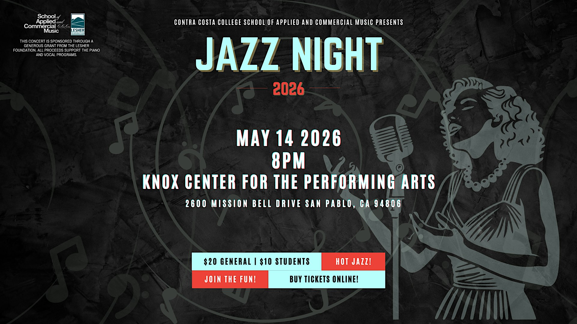 by admin13Feb Jazz Night Concert 2026 at Contra Costa College – San Pablo, CA Jazz Night Concert 2026 at Contra Costa College – San Pablo, CA 3 3 people viewed this event. Contra Costa College Jazz Vocal Program Tickets-RSVP Link Date And Time Friday, May 15th, 2026 03:00 AM (PST) Venue Contra Costa College Location 2600 Mission Bell Drive, San Pablo, CA 94806 Event Types MusicOther Event Category CaliforniaOakland Share With Friends Facebook Twitter Linkedin Xing Pinterest Share This Post: