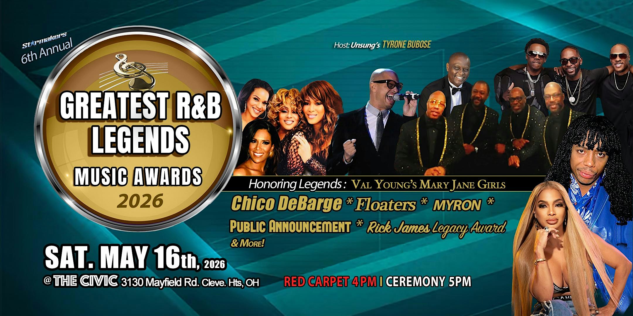 by admin13Feb 2026 Greatest R&B Legends Music Awards ft. Chico DeBarge, Mary Jane Girls at The Civic Conference & Event Center – Cleveland Heights, OH 2026 Greatest R&B Legends Music Awards ft. Chico DeBarge, Mary Jane Girls at The Civic Conference & Event Center – Cleveland Heights, OH 2 2 people viewed this event. Get ready to vibe live at the 2026 Greatest R&B Legends Music Awards with Chico DeBarge and Mary Jane Girls! Tickets-RSVP Link Date And Time Saturday, May 16th, 2026 08:00 PM (PST) Venue The Civic Conference & Event Center Location 3130 Mayfield Rd., Cleveland Heights, OH 44118 Event Types Concert or PerformanceMusic Event Category ClevelandOhio Share With Friends Facebook Twitter Linkedin Xing Pinterest Share This Post: