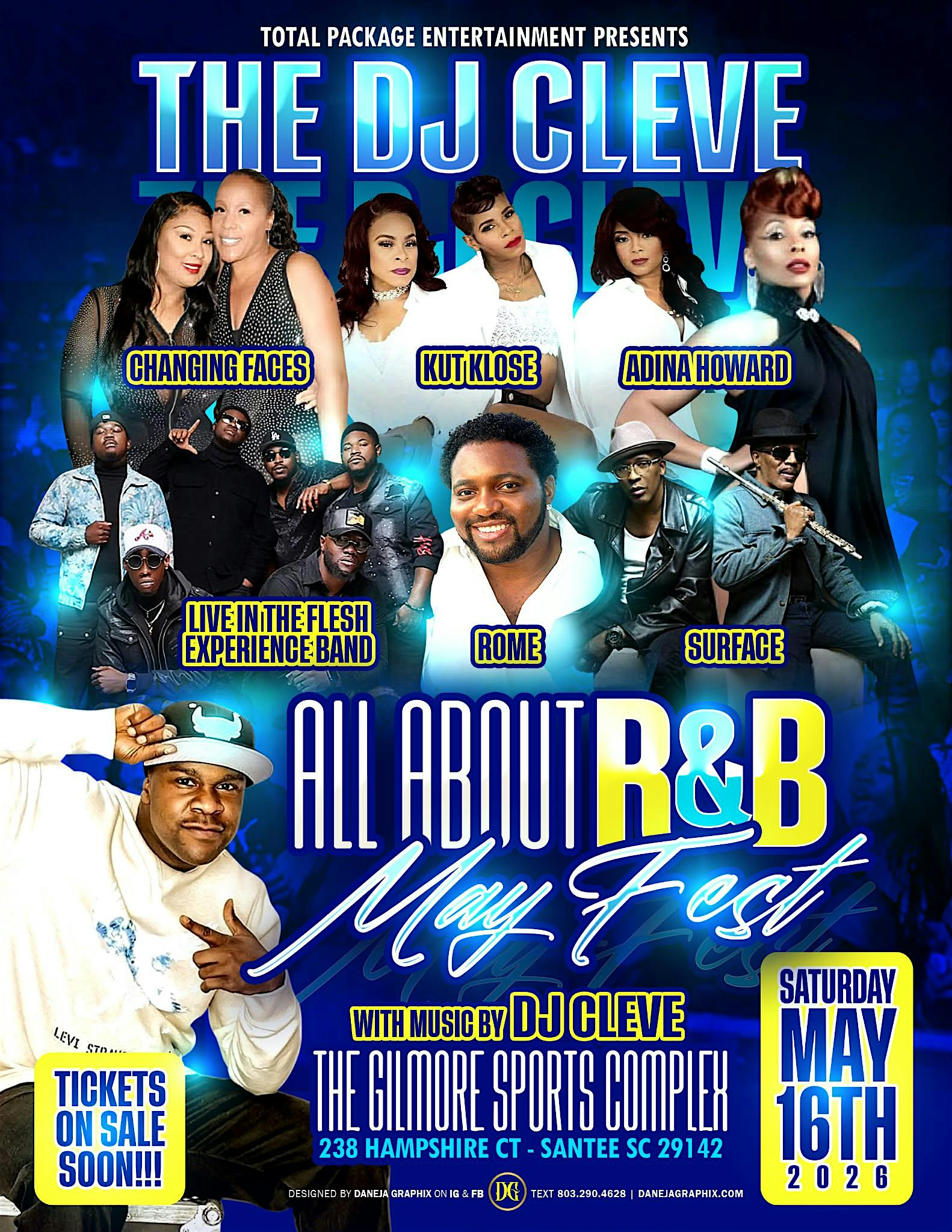 by admin13Feb DJ CLEVE ALL ABOUT R&B MAY FEST at Gilmore Sports Complex – Santee, SC DJ CLEVE ALL ABOUT R&B MAY FEST at Gilmore Sports Complex – Santee, SC 3 3 people viewed this event. The Dj Cleve All About R&B May Fest Saturday May 16th Featuring Kut Klose, Changing Faces, Adina Howard, Rome And Surface Tickets-RSVP Link Date And Time Saturday, May 16th, 2026 07:00 PM (PST) Venue Gilmore Sports Complex Location 238 Hampshire Court, Santee, SC 29142 Event Types Concert or PerformanceMusic Event Category South Carolina Share With Friends Facebook Twitter Linkedin Xing Pinterest Share This Post: