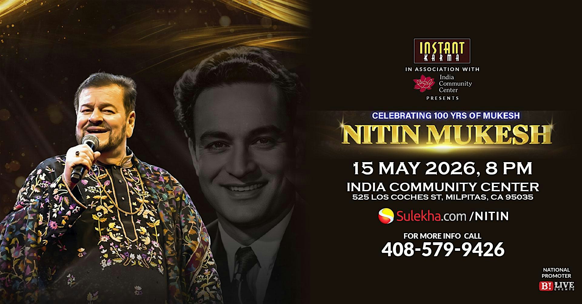 by admin13Feb NITIN MUKESH LIVE – Celebrating 100 Years Of Mukesh, Mehfill Style at India Community Center (ICC) – Milpitas, CA NITIN MUKESH LIVE – Celebrating 100 Years Of Mukesh, Mehfill Style at India Community Center (ICC) – Milpitas, CA 2 2 people viewed this event. A soulful mehfil celebrating 100 years of Mukesh — Nitin Mukesh live with timeless Bollywood classics ❤️ Tickets-RSVP Link Date And Time Saturday, May 16th, 2026 03:00 AM (PST) Venue India Community Center (ICC) Location 525 Los Coches Street, Milpitas, CA 95035 Event Types Concert or PerformanceMusic Event Category California Share With Friends Facebook Twitter Linkedin Xing Pinterest Share This Post: