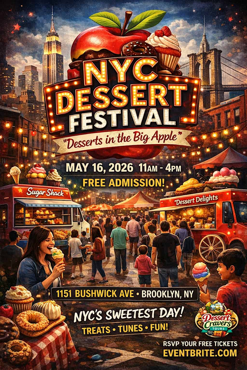 by admin14Feb NYC DESSERT FESTIVAL at 1151 Bushwick Ave – Brooklyn, NY NYC DESSERT FESTIVAL at 1151 Bushwick Ave – Brooklyn, NY 2 2 people viewed this event. It’s going to be a sweet day Tickets-RSVP Link Date And Time Saturday, May 16th, 2026 03:00 PM (PST) Venue 1151 Bushwick Ave Location 1151 Bushwick Avenue, Brooklyn, NY 11221 Event Types Festival or FairFood & Drink Event Category New York Share With Friends Facebook Twitter Linkedin Xing Pinterest Share This Post: