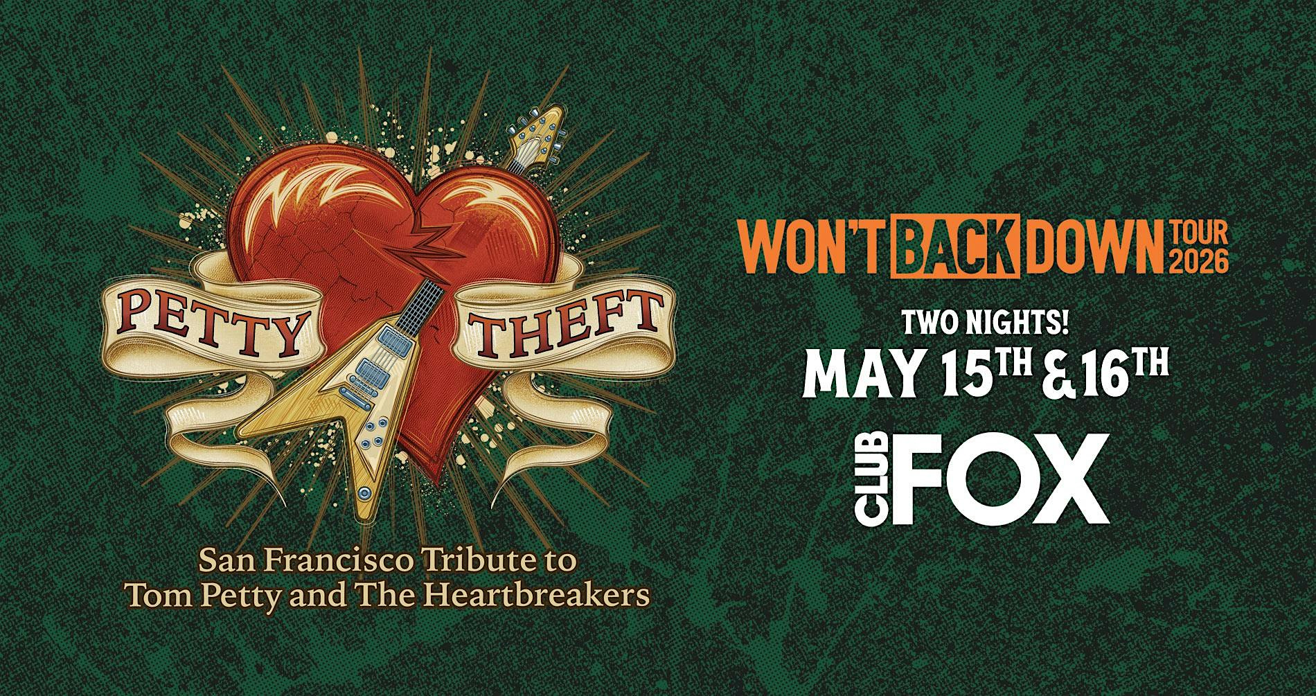 by admin13Feb PETTY THEFT – San Francisco Tribute to Tom Petty & The Heartbreakers at Club Fox – Redwood City, CA PETTY THEFT – San Francisco Tribute to Tom Petty & The Heartbreakers at Club Fox – Redwood City, CA 2 2 people viewed this event. WON’T BACK DOWN TOUR 2026 – Bay Area band PETTY THEFT is the ultimate tribute to rock n’ roll legend Tom Petty & The Heartbreakers! Tickets-RSVP Link Date And Time Saturday, May 16th, 2026 03:00 AM (PST) Venue Club Fox Location 2209 Broadway, Redwood City, CA 94063 Event Types Concert or PerformanceMusic Event Category CaliforniaOakland Share With Friends Facebook Twitter Linkedin Xing Pinterest Share This Post: