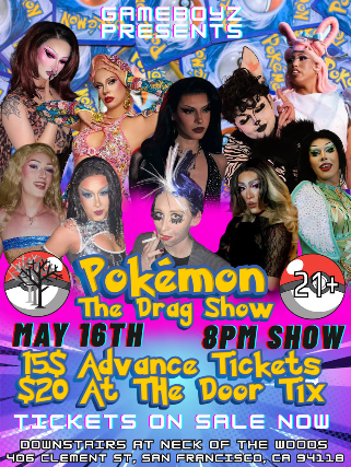 Gameboyz presents:Pokmon: The Drag ShowSaturday May16th 2026Neck of the Woods 406 Clement St San Francisco, CA 94118(downstairs)$15 in advance $20 at the doorDoors at 7pm21+
