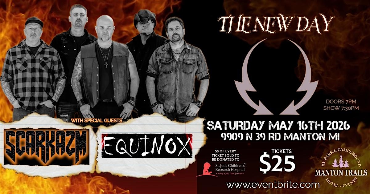 by admin13Feb The New Day LIVE at Manton Trails RV Park & Campground – Manton, MI The New Day LIVE at Manton Trails RV Park & Campground – Manton, MI 2 2 people viewed this event. Detroit Rock Band, The New Day LIVE wsg Scarkazm and Equinox. $5 from every ticket sold to be donated to St Judes Childrens Hospital. Tickets-RSVP Link Date And Time Saturday, May 16th, 2026 11:00 PM (PST) Venue Manton Trails RV Park & Campground Location 9909 North 39 Road, Manton, MI 49663 Event Types Concert or PerformanceMusic Event Category Michigan Share With Friends Facebook Twitter Linkedin Xing Pinterest Share This Post: