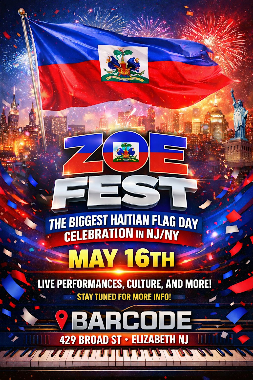 by admin13Feb ZOE FEST at BarCode Entertainment Complex – Elizabeth, NJ ZOE FEST at BarCode Entertainment Complex – Elizabeth, NJ 1 1 people viewed this event. The biggest Haitian Flag Day celebration in NJ/NY/PA/CT. Tickets-RSVP Link Date And Time Sunday, May 17th, 2026 01:00 AM (PST) Venue BarCode Entertainment Complex Location 429 North Broad Street, Elizabeth, NJ 7208 Event Types Festival or FairMusic Event Category New Jersey Share With Friends Facebook Twitter Linkedin Xing Pinterest Share This Post: