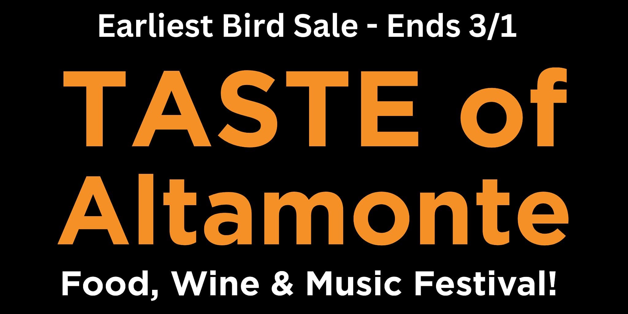 by admin14Feb Taste of Altamonte Food & Wine at Cranes Roost Park – Altamonte Springs, FL Taste of Altamonte Food & Wine at Cranes Roost Park – Altamonte Springs, FL 1 1 people viewed this event. Join us to Taste, Sip, & Savor unlimited food, drinks with live music lakeside. Benefits the Altamonte Springs Rotary Foundation non-profit. Tickets-RSVP Link Date And Time Thursday, May 21st, 2026 10:00 PM (PST) Venue Cranes Roost Park Location 274 Cranes Roost Boulevard, Altamonte Springs, FL 32701 Event Types Festival or FairFood & Drink Event Category Florida Share With Friends Facebook Twitter Linkedin Xing Pinterest Share This Post:
