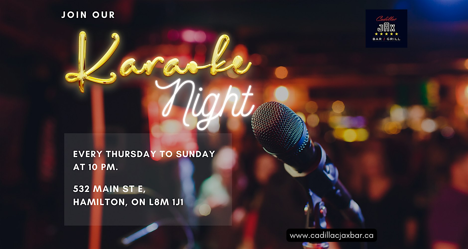 by admin13Feb Karaoke Nights at Cadillac Jax Bar & Grill – Hamilton, Canada Karaoke Nights at Cadillac Jax Bar & Grill – Hamilton, Canada 1 1 people viewed this event. Sing Your Heart Out! Karaoke Nights Thursday to Sunday, 10 PM onwards! Tickets-RSVP Link Date And Time Friday, May 22nd, 2026 02:00 AM (PST) Venue Cadillac Jax Bar & Grill Location 532 Main Street East, Hamilton, Canada L8M 1J1 Event Types MusicParty or Social Gathering Event Category Canada Share With Friends Facebook Twitter Linkedin Xing Pinterest Share This Post: