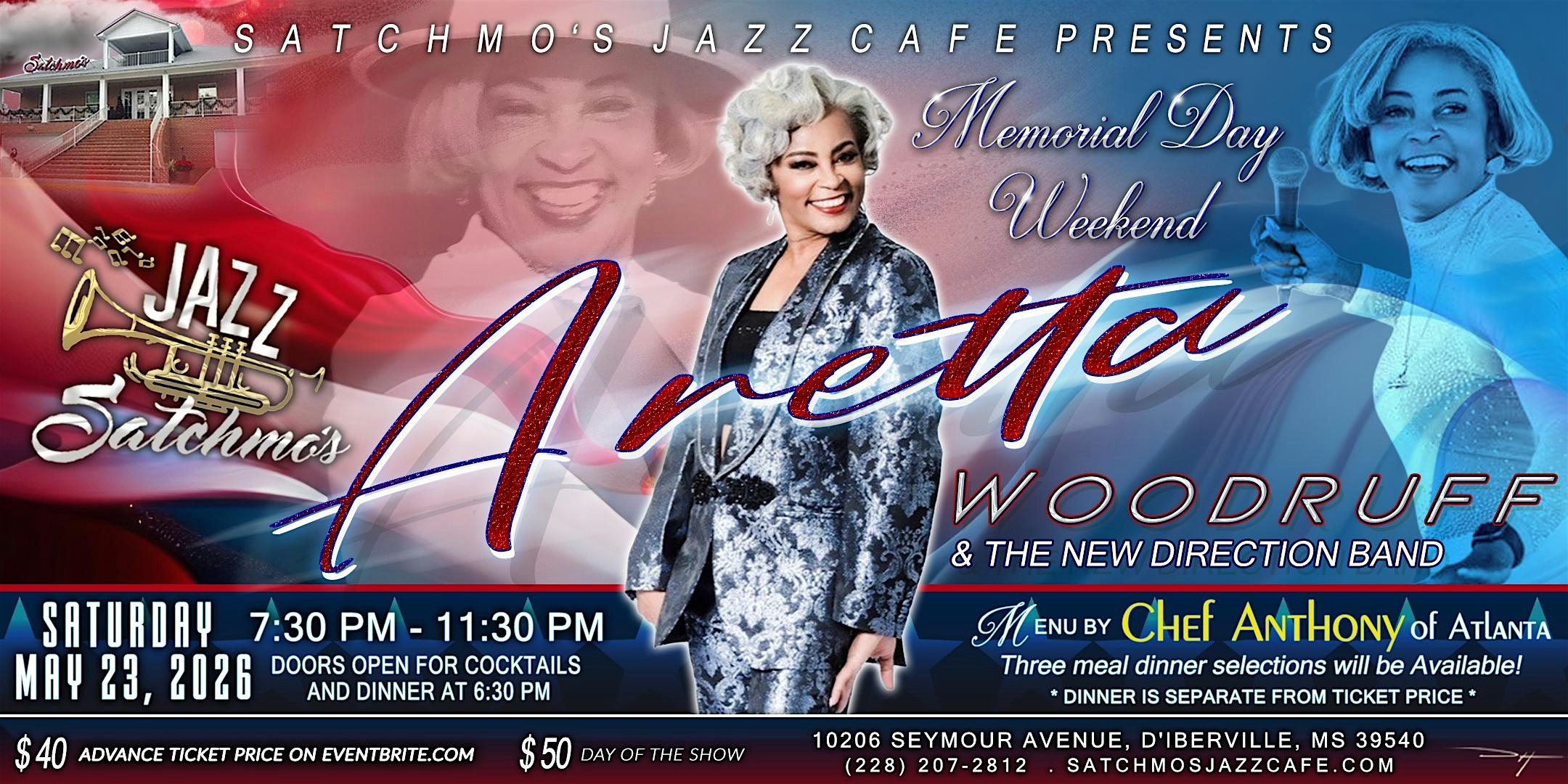 by admin13Feb Aretta Woodruff & The New Direction Band at Satchmo’s Jazz Cafe – D’Iberville, MS Aretta Woodruff & The New Direction Band at Satchmo’s Jazz Cafe – D’Iberville, MS 2 2 people viewed this event. Aretta Woodruff & The New Direction Band Memorial Day Weekend Show Saturday May 23, 2026 Tickets-RSVP Link Date And Time Sunday, May 24th, 2026 12:00 AM (PST) Venue Satchmo's Jazz Cafe Location 10206 Seymour Avenue, D'Iberville, MS 39540 Event Types Concert or PerformanceMusic Event Category Mississippi Share With Friends Facebook Twitter Linkedin Xing Pinterest Share This Post: