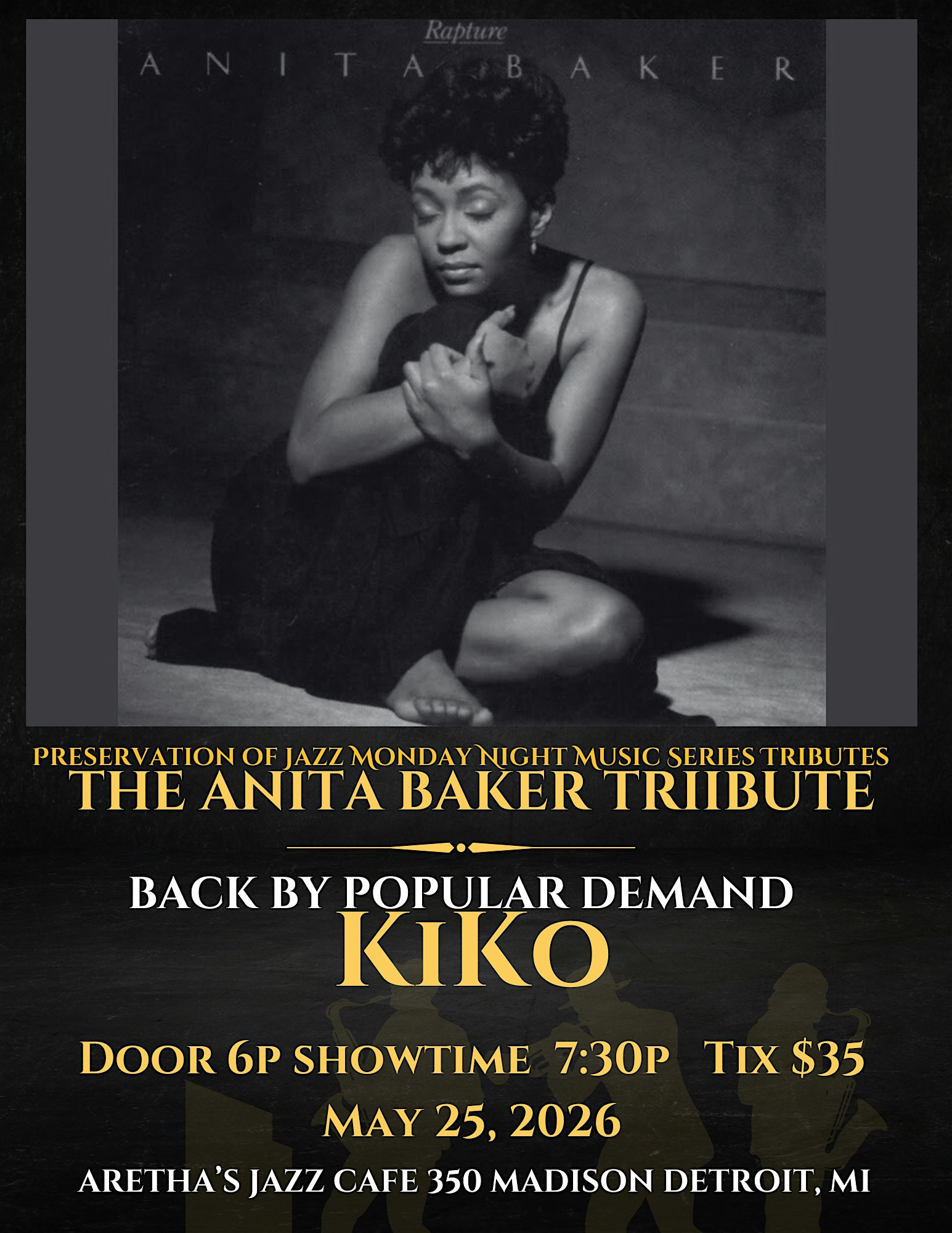 by admin13Feb Back by Popular Demand: The Anita Baker Tribute ft. Kiko at Aretha’s Jazz Cafe – Detroit, MI Back by Popular Demand: The Anita Baker Tribute ft. Kiko at Aretha’s Jazz Cafe – Detroit, MI 2 2 people viewed this event. Get ready to groove to the soulful tunes of Anita Baker with Kiko leading the tribute – it’s going to be a night to remember! Tickets-RSVP Link Date And Time Monday, May 25th, 2026 11:00 PM (PST) Venue Aretha's Jazz Cafe Location 350 Madison Street, Detroit, MI 48226 Event Types Concert or PerformanceMusic Event Category DetroitMichigan Share With Friends Facebook Twitter Linkedin Xing Pinterest Share This Post: