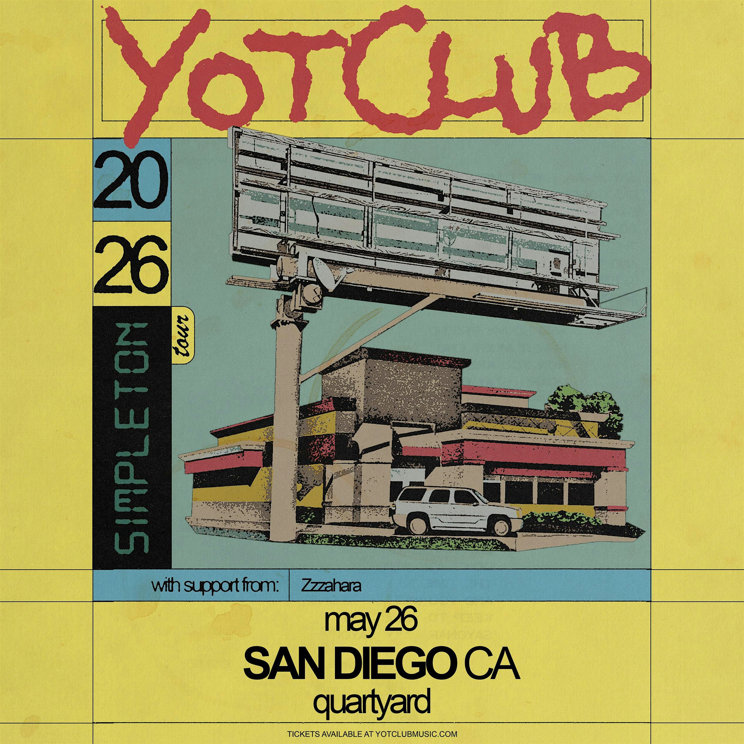 by admin13Feb Yot Club: Simpleton Tour with zzzahara at Quartyard – San Diego, CA Yot Club: Simpleton Tour with zzzahara at Quartyard – San Diego, CA 3 3 people viewed this event. Presented by Soda Bar Tickets-RSVP Link Date And Time Wednesday, May 27th, 2026 01:00 AM (PST) Venue Quartyard Location 1301 Market Street, San Diego, CA 92101 Event Types Concert or PerformanceMusic Event Category CaliforniaSan Diego Share With Friends Facebook Twitter Linkedin Xing Pinterest Share This Post: