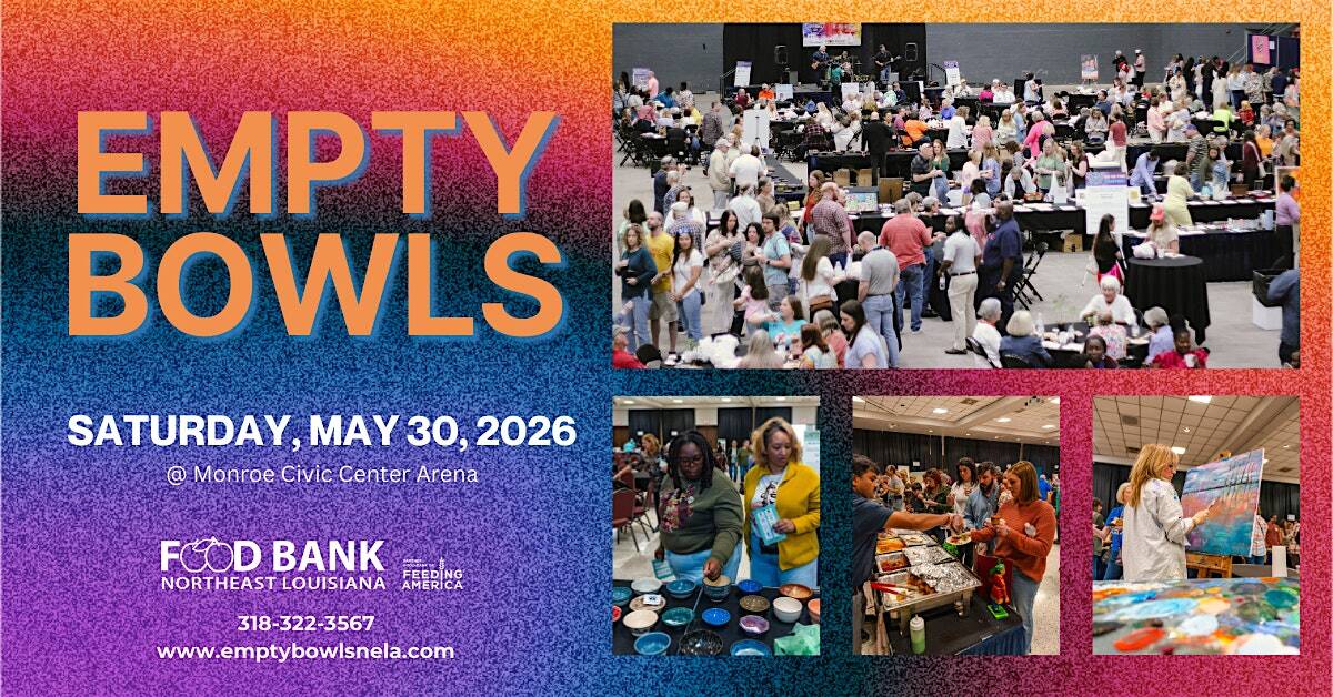 by admin14Feb Empty Bowls Northeast Louisiana 2026 at Monroe Civic Center – Monroe, LA Empty Bowls Northeast Louisiana 2026 at Monroe Civic Center – Monroe, LA 1 1 people viewed this event. Get ready to enjoy a bowlful of creativity and community spirit at Empty Bowls Northeast Louisiana 2026! Tickets-RSVP Link Date And Time Saturday, May 30th, 2026 04:00 PM (PST) Venue Monroe Civic Center Location 401 Lea Joyner Memorial Expressway, Monroe, LA 71201 Event Types Food & DrinkOther Event Category Louisiana Share With Friends Facebook Twitter Linkedin Xing Pinterest Share This Post: