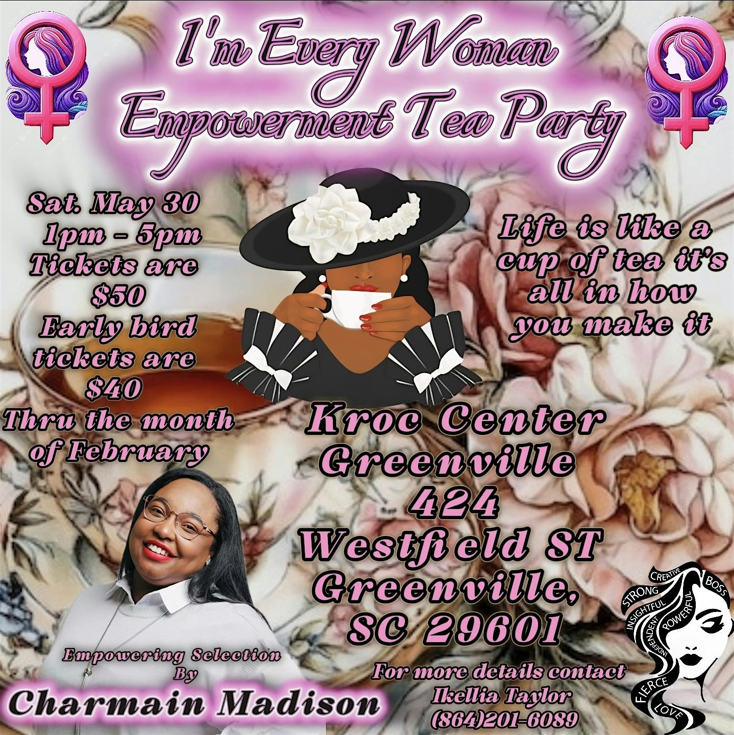by admin13Feb I’m every woman Empowerment tea party at The Salvation Army Kroc Center Greenville – Greenville, SC I’m every woman Empowerment tea party at The Salvation Army Kroc Center Greenville – Greenville, SC 1 1 people viewed this event. A simple tea table became a space where faith, sisterhood and purpose met. Come join us let your hair down and come ready to celebrate you. Tickets-RSVP Link Date And Time Saturday, May 30th, 2026 05:00 PM (PST) Venue The Salvation Army Kroc Center Greenville Location 424 Westfield Street, Greenville, SC 29601 Event Types OtherParty or Social Gathering Event Category South Carolina Share With Friends Facebook Twitter Linkedin Xing Pinterest Share This Post: