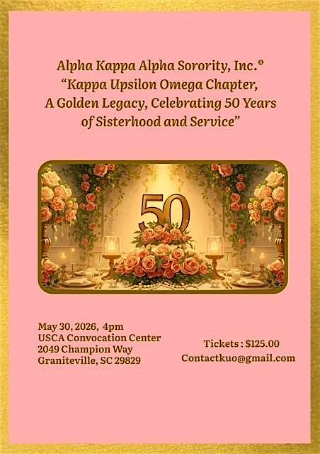 by admin13Feb Kappa Upsilon Omega’s 50th Anniversary at USCA Convocation Center – Graniteville, SC Kappa Upsilon Omega’s 50th Anniversary at USCA Convocation Center – Graniteville, SC 1 1 people viewed this event. Celebrating 50 years of excellence – the Kappa Upsilon Omega Chapter of Alpha Kappa Alpha Sorority Incorporated®! Tickets-RSVP Link Date And Time Saturday, May 30th, 2026 08:00 PM (PST) Venue USCA Convocation Center Location 2049 Champion Way, Graniteville, SC 29829 Event Types Community & CultureParty or Social Gathering Event Category South Carolina Share With Friends Facebook Twitter Linkedin Xing Pinterest Share This Post: