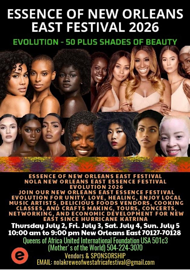 by admin27Feb NOLA NEW ORLEANS EAST ESSENCE FEST 2026 at Read Boulevard East – New Orleans, LA NOLA NEW ORLEANS EAST ESSENCE FEST 2026 at Read Boulevard East – New Orleans, LA 2 2 people viewed this event. JOIN OUR NEW ORLEANS EAST ESSENCE FEST FOR UNITY, LOVE, ANCESTRY, TOURS, ENJOY LOCAL MUSIC ARTISTS, DELICIOUS FOODS & RETAIL VENDORS Tickets-RSVP Link Date And Time Thursday, July 2nd, 2026 @ 10:00 AM Location Read Blvd Event Types Community & CultureEssence Festival Event Category LouisianaNew Orleans Share With Friends Facebook Twitter Linkedin Xing Pinterest Share This Post:
