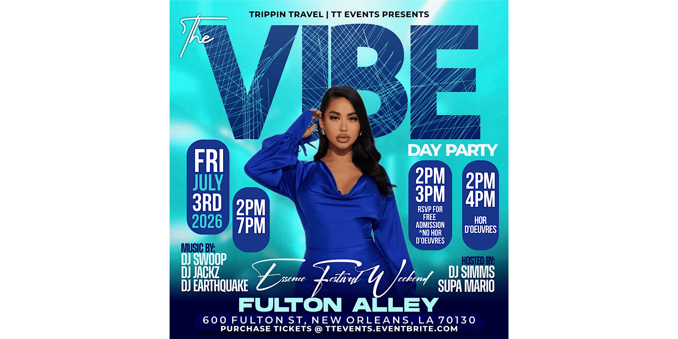 by admin27Feb THE VIBE DAY PARTY N’awlins FEST WEEKEND 2026 at Fulton Alley – New Orleans, LA THE VIBE DAY PARTY N’awlins FEST WEEKEND 2026 at Fulton Alley – New Orleans, LA 1 1 people viewed this event. The Vibe Day Party weekend 2026 Tickets-RSVP Link Date And Time Friday, July 3rd, 2026 @ 02:00 PM Location 600 Fulton St Event Types Essence FestivalMusicParty or Social Gathering Event Category LouisianaNew Orleans Share With Friends Facebook Twitter Linkedin Xing Pinterest Share This Post: