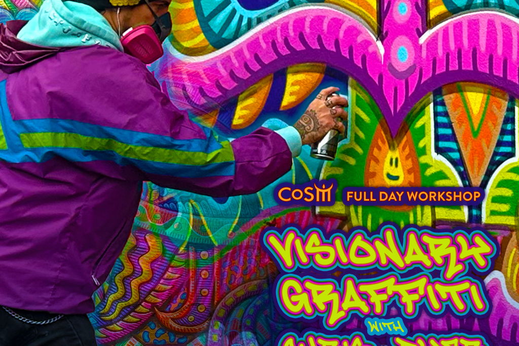 For the final few hours, we head outdoors to “Chris’ Corner” at the end of the Wisdom Trail at CoSM, a spot where Chris has been painting murals and “whimsical, trippy characters” for over a decade. Students will have the opportunity to observe Chris in action and ask questions, as well as try out his spray cans to explore this tricky medium on a practice panel.