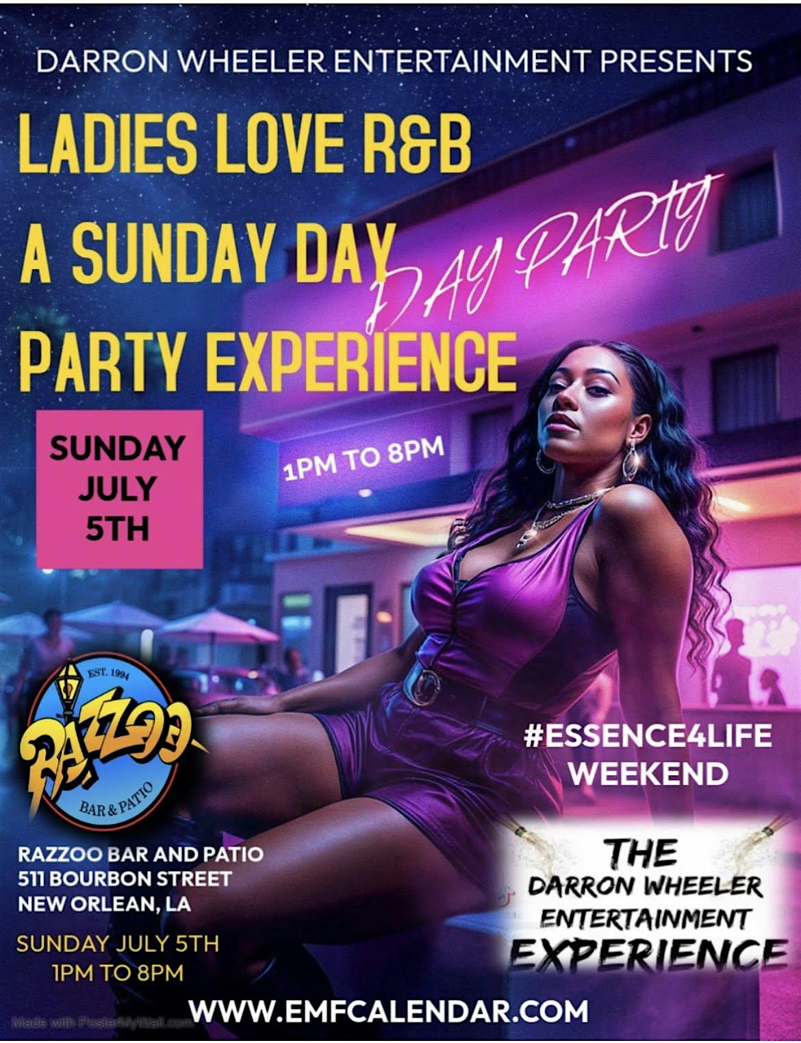 by admin27Feb RNB SUNDAY with Darron Wheeler Entertainment at Razzoo Bar & Patio – New Orleans, LA RNB SUNDAY with Darron Wheeler Entertainment at Razzoo Bar & Patio – New Orleans, LA 2 2 people viewed this event. An epic RNB SUNDAY filled with soulful vibes and smooth tunes by some of the best DJ’s from around the globe at The #Essence4Life Weekend Tickets-RSVP Link Date And Time Sunday, July 5th, 2026 @ 01:00 PM Location 511 Bourbon Street Event Types Concert or PerformanceEssence FestivalPerforming & Visual Arts Event Category LouisianaNew Orleans Share With Friends Facebook Twitter Linkedin Xing Pinterest Share This Post: