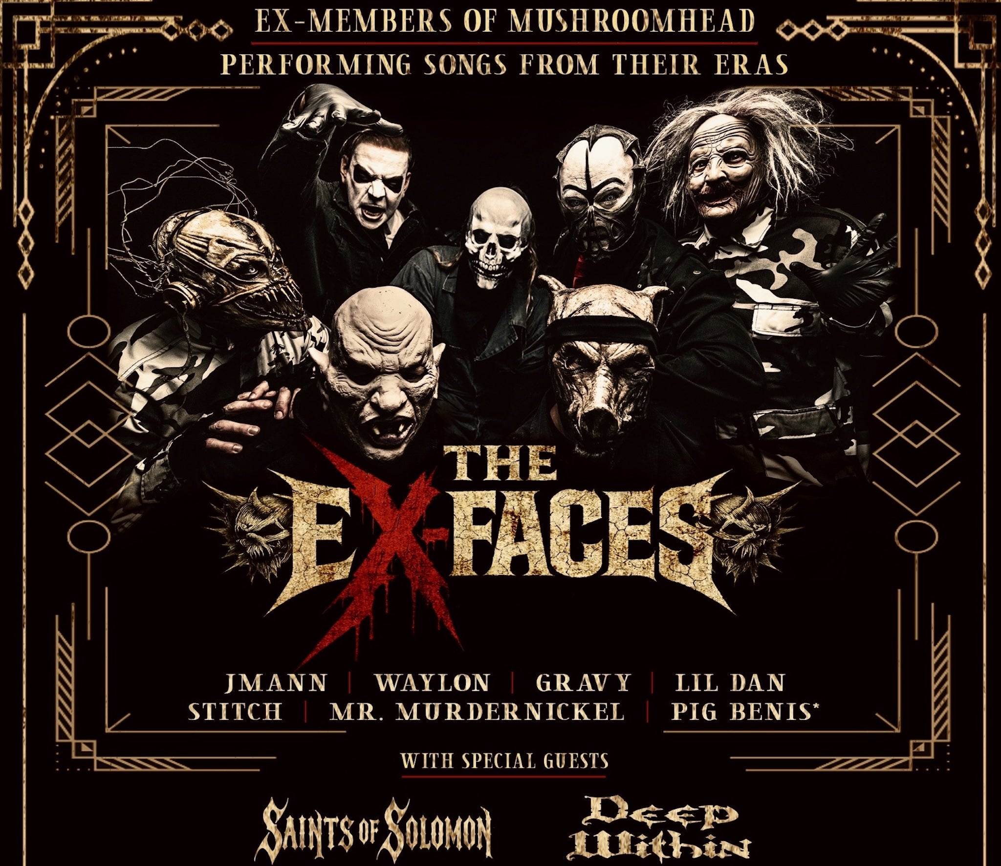 The Ex-Faces are a heavy metal supergroup formed by seven former members of the band Mushroomhead, reuniting to perform songs from their respective eras in the band. The lineup, announced for 2026 shows, includes vocalists J Mann and Waylon Reavis, guitarists Gravy and Stitch, and bassist Pig Benis.