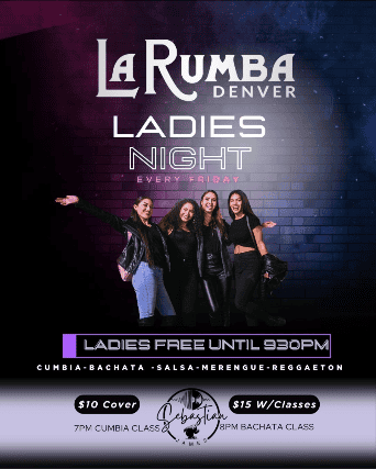 Ladies Night Friday at La Rumba! ✨ Ladies get in FREE until 930 PM! ✨ Enjoy the best Cumbia Sonidera, Bachata, Reggaetn & more! ️ Cover: $10 | $6 Shots & Domestic Beer Two dance classes to start the RUMBA! 7 PM – Bachata Class 8 PM – Cumbia Class with Sebastian James Only $15 for both classes, includes entry to La Rumba Dont miss out! Reserve your VIP table at TEXT 720.276.8122 Viernes de Ladies Night en La Rumba! ✨ Chicas GRATIS hasta las 930 PM! ✨ Disfruta de la mejor Cumbia Sonidera, Bachata, Reggaetn y ms! ️ Cover: $10 | Shots $6 stica Dos clases para empezar la RUMBA! 7 PM – Clase de Bachata 8 PM – Clase de Cumbia con Sebastian James Solo $15 por ambas clases, incluye entrada a La Rumba No te lo pierdas! Reserva tu mesa VIP al TEXTO 720.276.8122#EstaSiEsRumba #LadiesNight #Cumbia #Bachata #Reggaeton #DenverNightlife