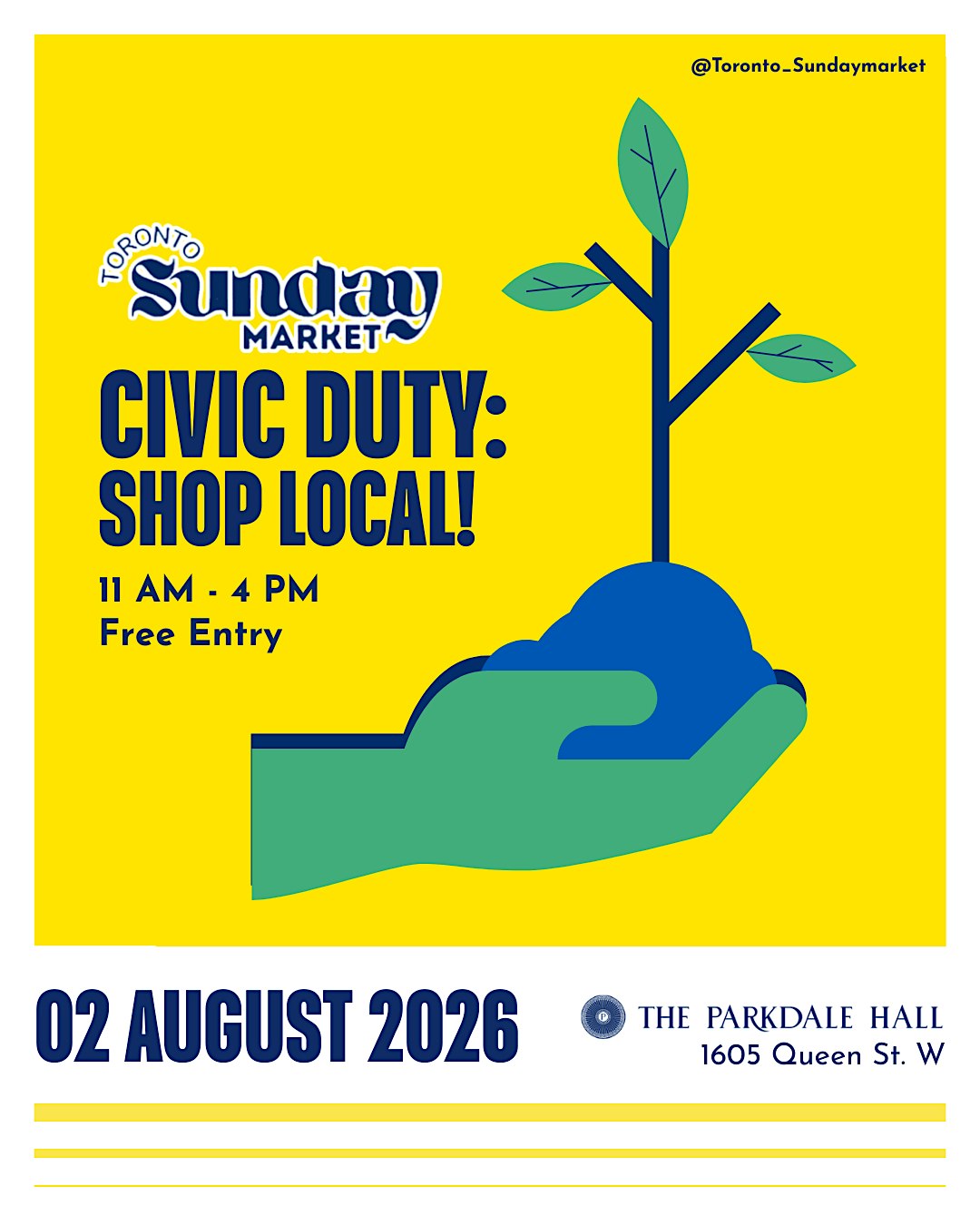 by admin12Feb Civic Duty: Shop Local at The Parkdale Hall – Toronto, ON Civic Duty: Shop Local at The Parkdale Hall – Toronto, ON 4 4 people viewed this event. The long weekend starts here! Shop, snack, and celebrate Toronto’s creative heartbeat. Tickets-RSVP Link Date And Time Sunday, August 2nd, 2026 03:00 PM (PST) Venue The Parkdale Hall Location 1605 Queen Street West, Toronto, ON M6K 3B8 Event Types Festival or FairOtherSeasonal & Holiday Share With Friends Facebook Twitter Linkedin Xing Pinterest Share This Post: