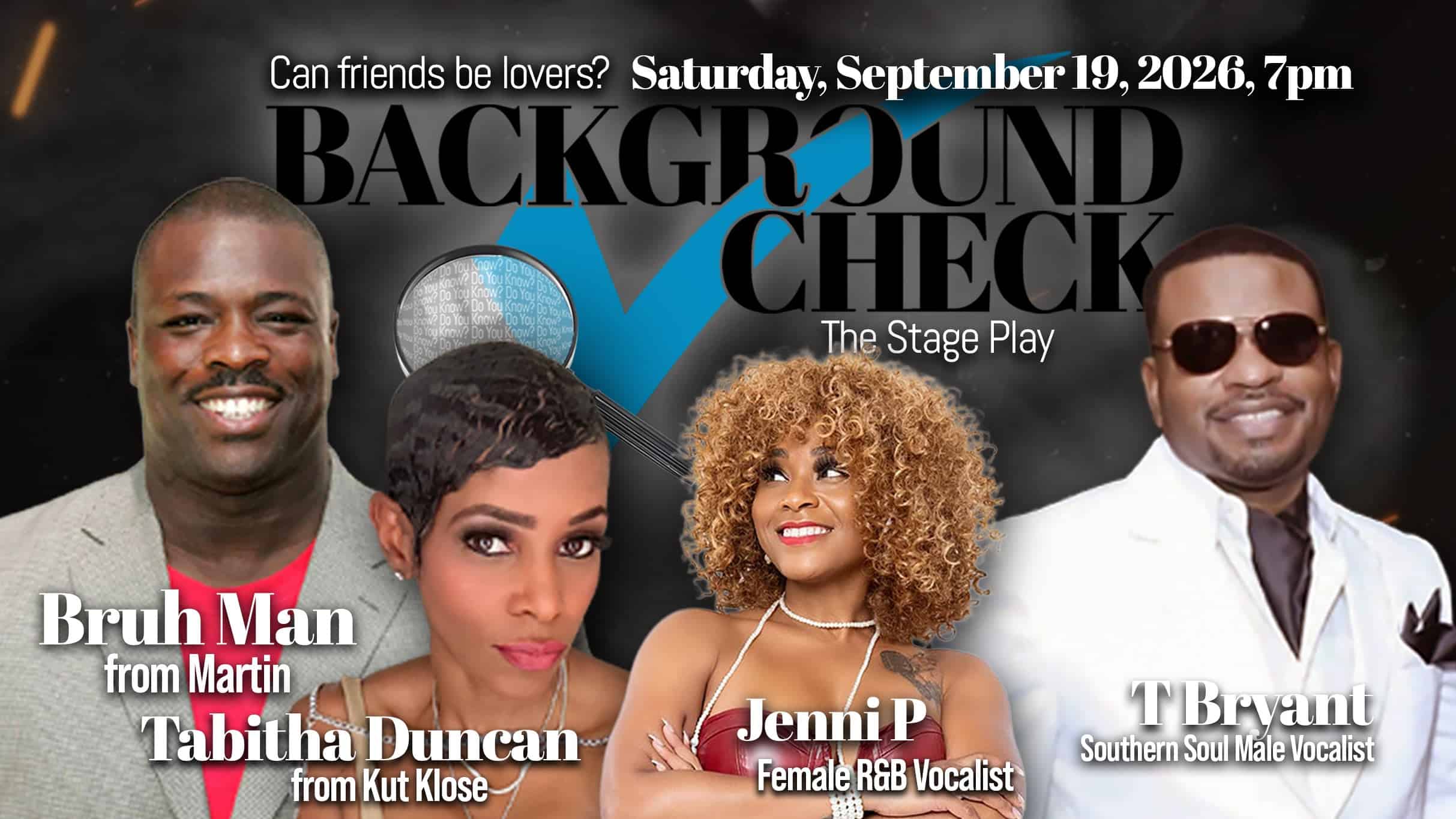 Featuring special guest celebrity appearances by Bruh Man from the hit TV sitcoms Martin and The Bernie Mac Show Tabitha Duncan of the iconic R&B group Kut Klose Southern Soul male vocalist T. Bryant and female singing sensation Jenni P.along with some of San Antonios hottest rising actors and comedians, backed by a live band. Set during a 20 year high school reunion, Background Check explores friendship, trust, romance, and the impact of social media on modern relationships. Blending pop culture, Laugh out loud humor, soul stirring music, and heartfelt storytelling, this must see production promises a night audiences will laugh through, think through, and talk about long after the curtain closes.