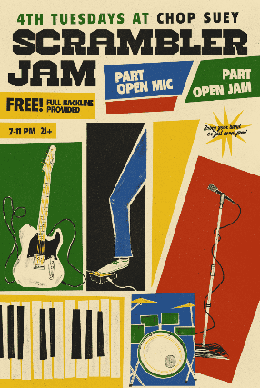 SCRAMBLER JAM | 21+ | FREEEvery 4th Tuesday at Chop Suey we invite you to this one of a kind, part open mic, part open jam session, with comics in supporting roles. Full backline provided. Sign ups start at 7PM and the show starts at 8. This event is 21+ and free. Scrambler Jam is not just about the show but also about strengthening the local community! The audience is just as important as the performers.